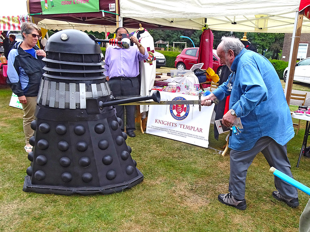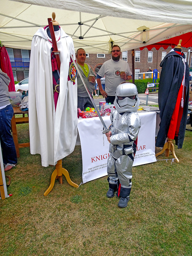 Most years Middlesex Provincial Priory has a stand at the Middlesex Grand Family Fete. These pictures are from July 2019. On the left our Provincial Prior is defending everyone from a Dalek invasion. On the right even a young Stormtrooper was joining in the sword action.